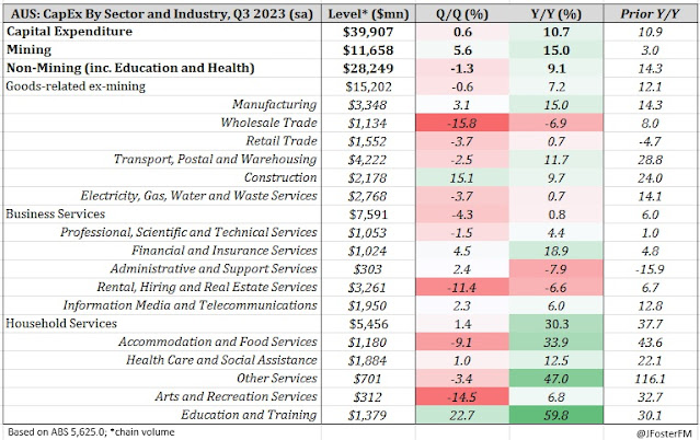 Business investment — Private sector capex slowed to a 0.6% rise in Q3 following strong momentum through the first half of the year. The expiration of tax incentives at the end of the financial year weighed on non-mining equipment investment (-0.5%).