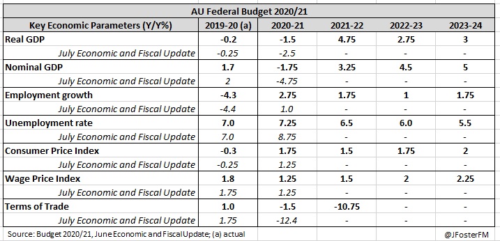 On the payments side, the largest item is the extension to the JobKeeper scheme through to the end of March 2021 that costs $15.6bn. The Government's JobMaker plan includes an incentive for businesses to hire young workers as the demographic hardest hit by the upheaval in the labour market. A hiring credit of between $100-$200 a week will be available to employers who take on previously unemployed young workers (aged between 16-35) payable for 12 months for new jobs (minimum 20 hours/wk) created over the period up to 6 October next year. Additionally, there is an expansion of the existing wage subsidy scheme for new apprentices and trainees. Infrastructure is also a key focus with $6.7bn in funding available to the states and territories over the next 4 years to roll out new projects on an accelerated basis. More support payments will be forthcoming, with pensioners and other welfare recipients to receive two additional payments of $250.