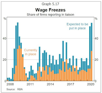 According to the recent RBA Statement on Monetary Policy, the central bank's liaison with industry reported a rising prevalence of firms within the program that had either or were planning on implementing wage freezes in the year ahead (see chart below). This will mainly show up in the private sector WPI. Meanwhile, we can expect public sector wages growth to slow this quarter reflecting the impact of wage deferrals and freezes, in particular affecting Commonwealth and Queensland Government workers.