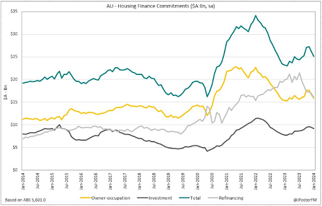 Australian CPI inflation printed at 3.4%yr in February, coming in below the 3.5% consensus estimate and leaving the pace unchanged since December. Downside misses on headline inflation in the past two reports suggest that inflationary risks are continuing to ease and that Australia has seemingly avoided the sort of pick-up in inflation seen in US in the early part of the year. However, there were elements in the report that were less encouraging, including trimmed mean inflation ticking up from 3.8% to 3.9% and services prices elevating from 3.7% to 4.2%. Overall, the report broadly validates the RBA's inflation outlook but also its caution. My review of the CPI report has more analysis here. Also of note domestically this week, February retail sales moderated to a 0.3% month-on-month rise, slightly weaker than the 0.4% lift expected; however, discretionary categories outperformed (0.6%), with the ABS linking this to spending associated with the Taylor Swift Eras Tour (see here). Meanwhile, despite a 6.1% retracement in the 3-months to February, job vacancies remain elevated at just over 360k, the data consistent with an easing but still-robust labour market.