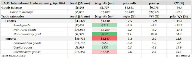 Australia's goods trade surplus widened more than expected to $6.5bn in April (vs $5.5bn) from a revised $4.8bn in March ($5bn reported initially). Despite export revenue falling in the month (-2.5%), a slump in import spending (-7.2%) saw the surplus widen.