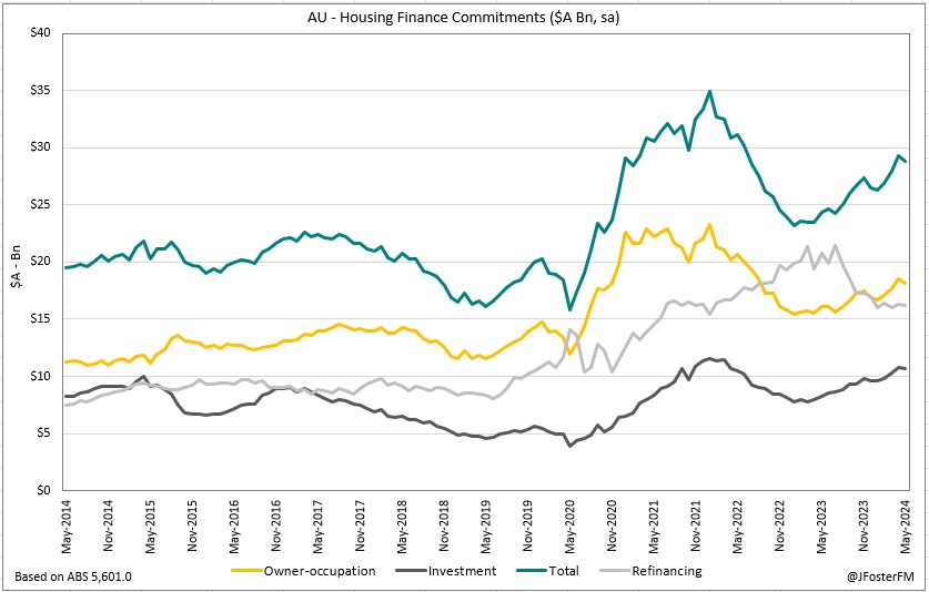 Monthly exports lifted by 1.7% to $43.8bn in June (-2.8%yr). This reflected increases across the board: rural goods 5.6%, non-rural goods 0.8% and non-monetary gold 5.6%. However, export values saw a 3.4% decline for the June quarter, retracing to $129.3bn - the lowest level since the final quarter of 2021. Commodity price weakness on softer global demand led to weakness in rural goods (-5.1%) and non-rural goods (-3.6%). The ABS's trade price series, also released today, showed export prices were down 5.9% for Q2 as iron, coal and natural gas all saw material price declines.